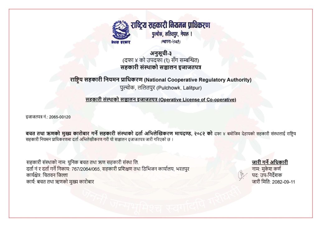 यस युनिक साकोसलाई राष्ट्रिय सहकारी नियमन प्राधिकरण ( NCRA ) ले बिधिवत दर्ता गरि मिति २०८२/०९ / ११ गतेका दिन सन्चालन इजाजत प्रदान गरेको छ ।