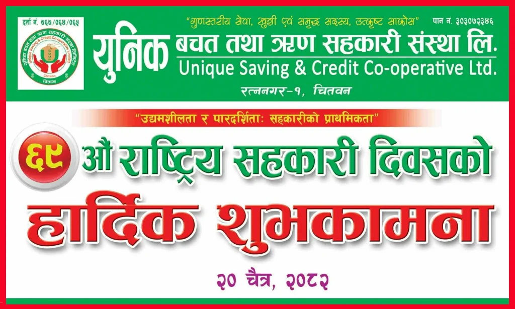 ६९औं राष्ट्रिय सहकारी दिवसको सुखद अवसरमा सम्पूर्ण सहकारी अभियन्ताज्युहरु, हाम्रा सम्पूर्ण शेयर सदस्यज्युहरु, कर्मचारी तथा शुभेच्छुकहरूमा हार्दिक बधाई तथा शुभकामना व्यक्त गर्दछौं।